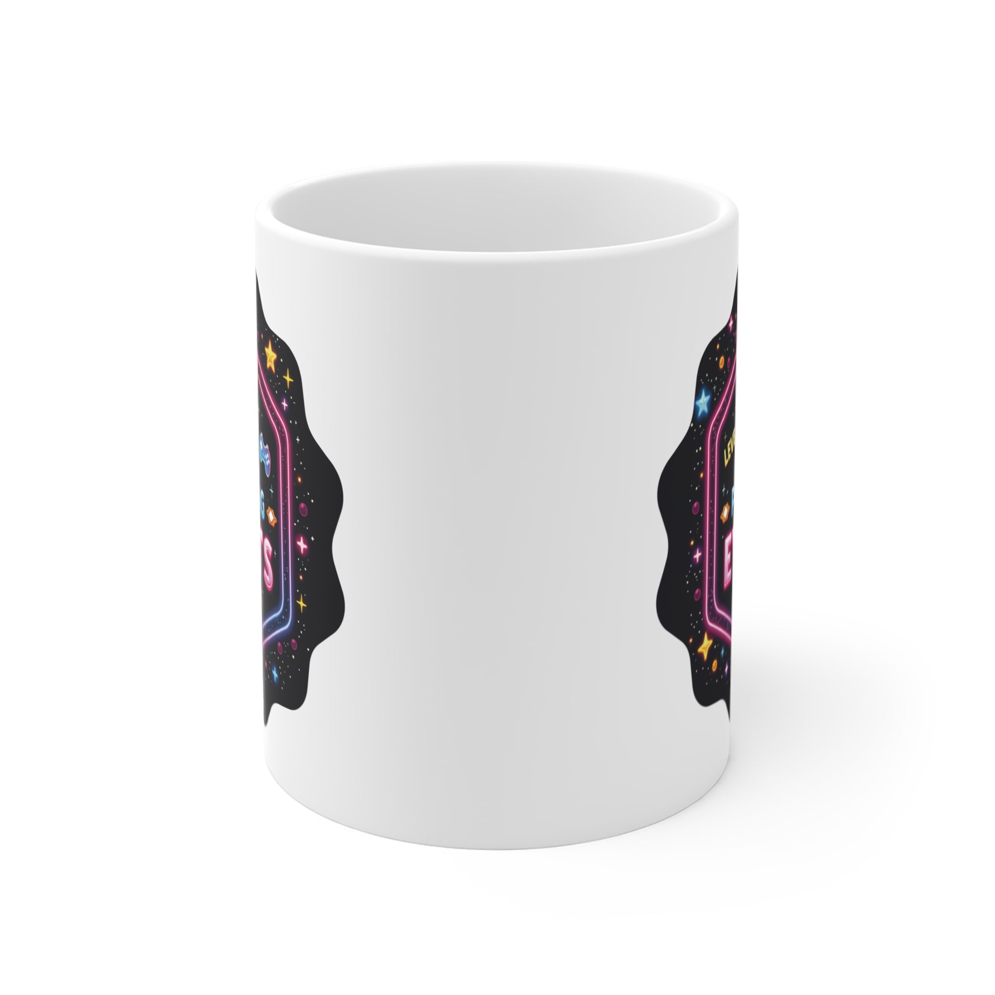 A gaming-themed 11oz ceramic mug perfect for gaming events. This mug is microwave and dishwasher-safe, featuring rounded corners and a C-handle. Ideal for gamers and gaming enthusiasts, it's a great gift for birthdays, holidays, and any gaming-related occasion.