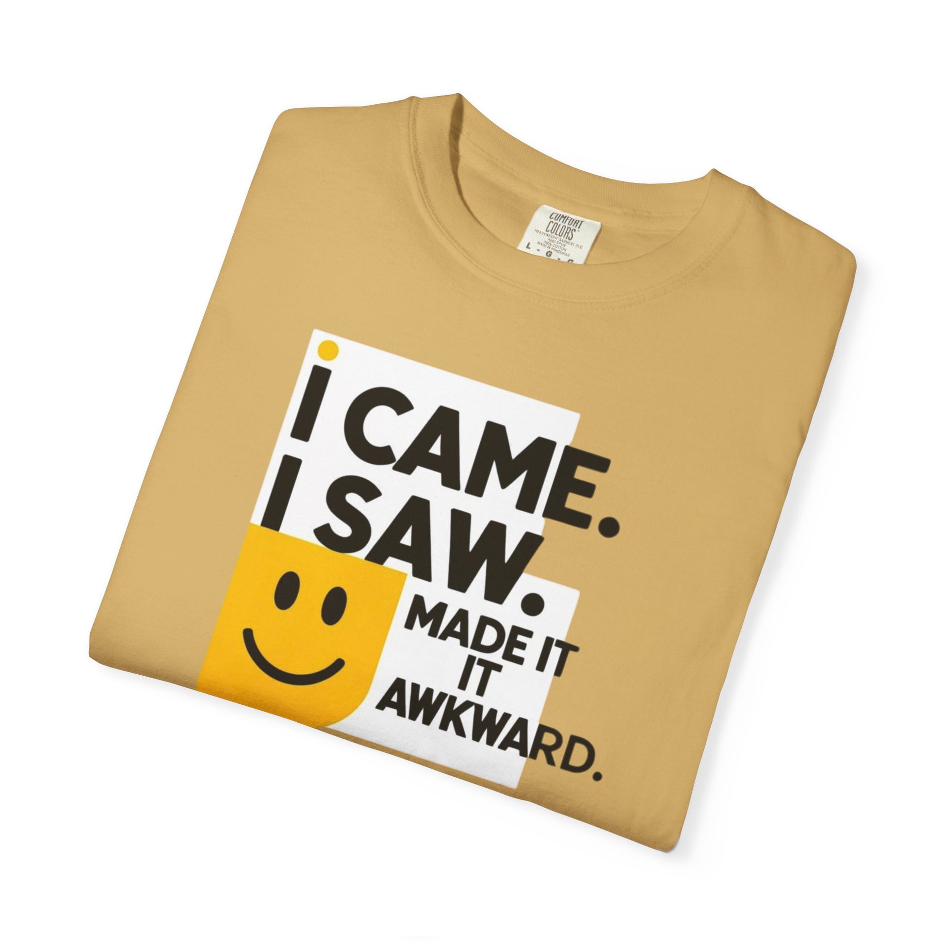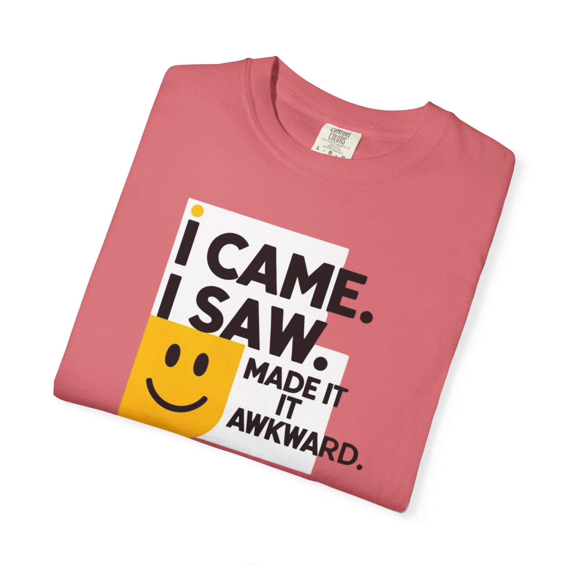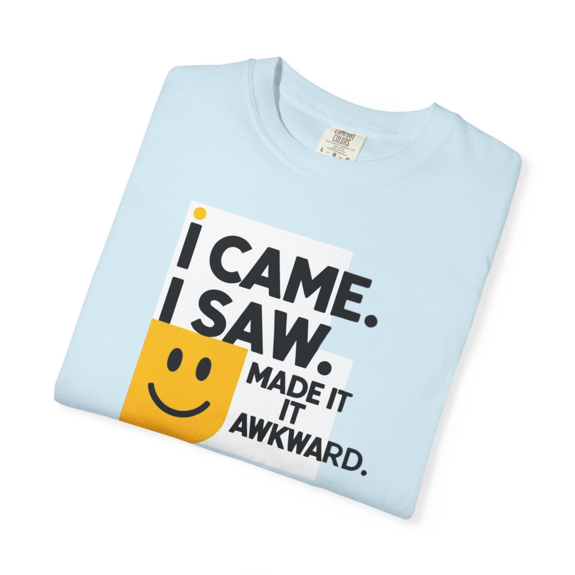 This T-shirt features a quirky and humorous design that says 'I Came I Saw I Made It Awkward'. It gives off a fun and light-hearted vibe, perfect for those who enjoy adding a touch of humor to their wardrobe. This T-shirt is great for casual outings, social events, and hanging out with friends. It is relevant for holidays, birthdays, and everyday wear.
