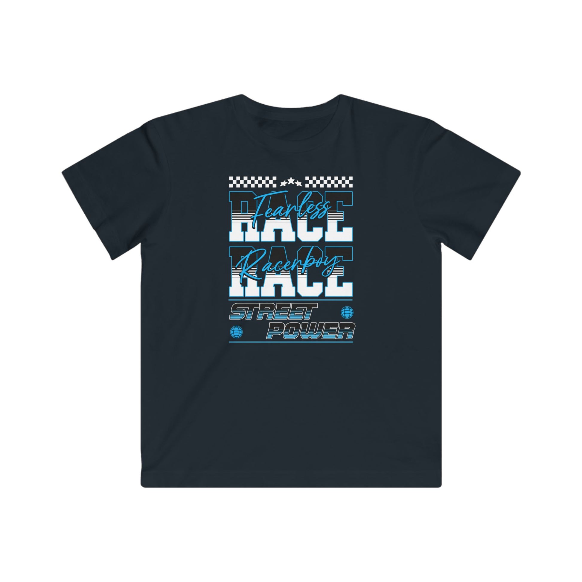 Fearless racerboy design on a light, comfortable Kids Tee. Perfect for young boys who love racing and adventure. Ideal for birthday parties, playdates, and everyday wear.